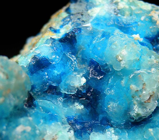 Deep blue crystals of Veszelyite on sky blue Hemimorphite. The Hemimorphite forms a botryoidal surface with a beautiful color contrast to the Veszelyite and is highly translucent. Mined in 2022. The locality is a former Limestone quarry with Lead, Zinc, and Copper mineralization that closed in 2018.