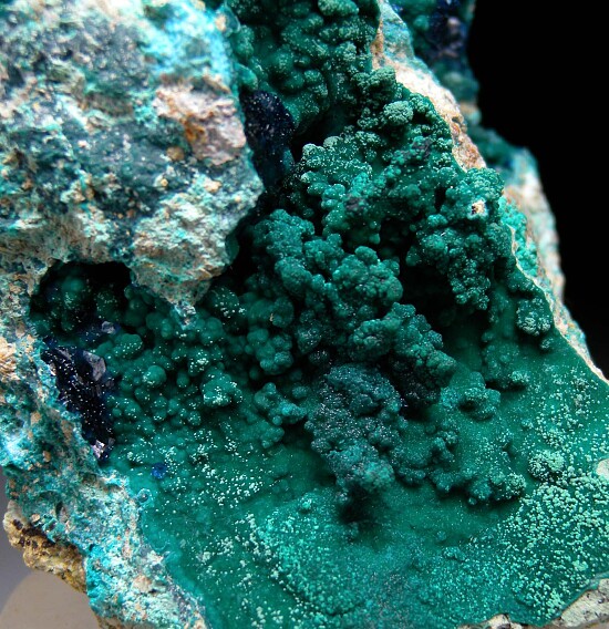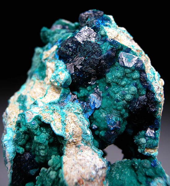 Sparkling deep blue crystals of Veszelyite to 1.3cm on a vuggy matrix covered by Zincolibethenite. Good large crystals in various areas, including some additional crystals deep in vugs not seen in photos. Mined in 2022. The locality is a former Limestone quarry with Lead, Zinc, and Copper mineralization that closed in 2018.