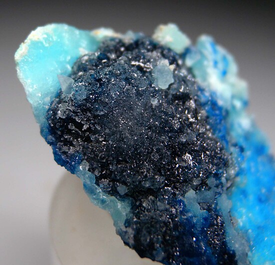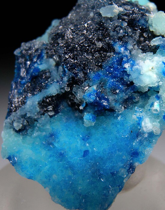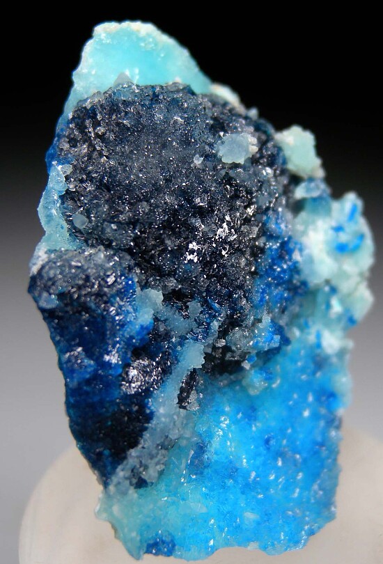 Fantastic new specimen of Vezelyite from the Rep. of Congo. Deep blue crystals of Veszelyite on sky blue Hemimorphite. There are two generations of Veszelyite on this specimen, including a darker blue 2cm wide (!) hemispherical group, and smaller lighter blue crystals. Mined in 2022. The locality is a former Limestone quarry with Lead, Zinc, and Copper mineralization that closed in 2018.