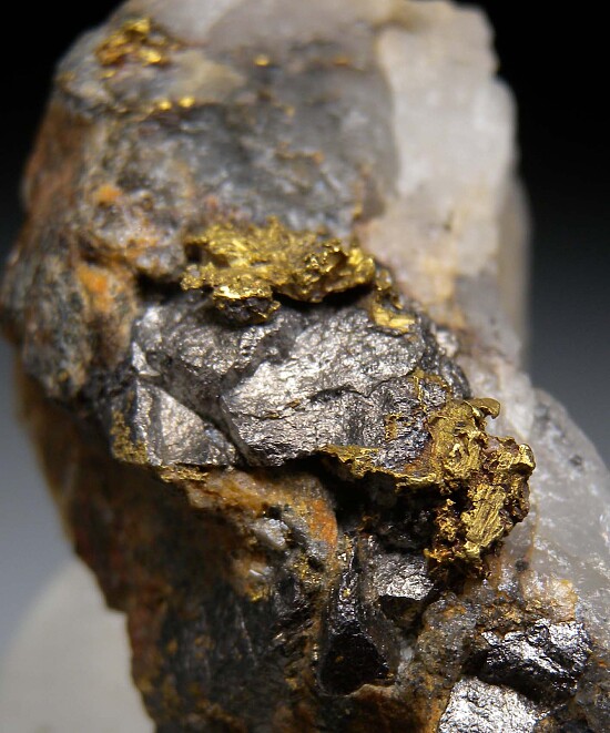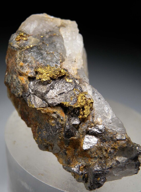 Discovered in 1875, the Homestake Mine was a deep underground gold mine that operated until 2002. For a period, it was the largest and deepest gold mine in North America. The mine produced more than forty million troy ounces of gold during its lifetime. Despite this, Gold specimens from this mine are scarce. This specimen features multiple areas of exposed Gold in a Quartz matrix along with what are likely Arsenopyrite crystals (two old labels, one from the Hauck collection and one from Kristalle, indicate the other mineral is Sylvanite). The Gold extends all the way through the Quartz in areas. Uncommon, hard to find USA Gold specimen.