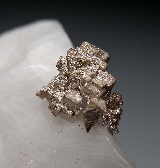 Silver crystals that have been exposed from white Calcite. Cubic Silver crystals are uncommon and these are superbly formed, sharp cubes in a cluster 8mm in size. The matrix is solid white Calcite that could easy be trimmed or etched to a smaller size if desired.