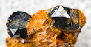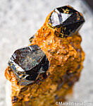 Two Rutile crystals in Pyrophyllite. Both Rutile crystals are perfect and complete all around with a dark, submetallic luster.
