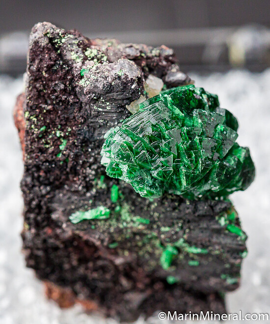 A 1.3cm wide 'pinwheel' group of Zincolivenite crystals on matrix (formerly known as Cuprian Adamite). Undamaged group of crystals with isolated individual crystals and another lighter green mineral on the matrix.