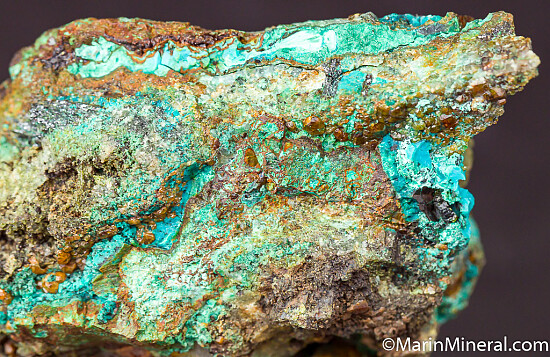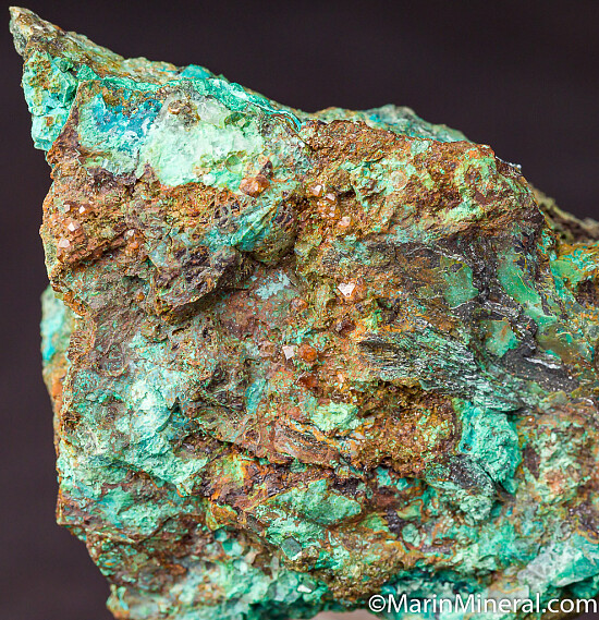 Uncommon and colorful specimen of brown Andradite crystals, Chrysocolla, Quartz, and a platy silvery mineral (likely either Hematite or Molybdenite). Rare old specimen from an obscure and defunct Copper mine.