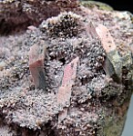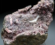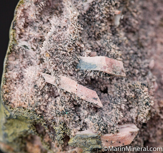 Large open vug filled with pink crystals of Inesite from the classic California locality. I like the mixture of both the smaller drusy crystals and the larger, well defined individual crystals. This si fromt eh dealer stock of Chuck Trantham and comes with an old Al McGuinness label showing an old price of $60.