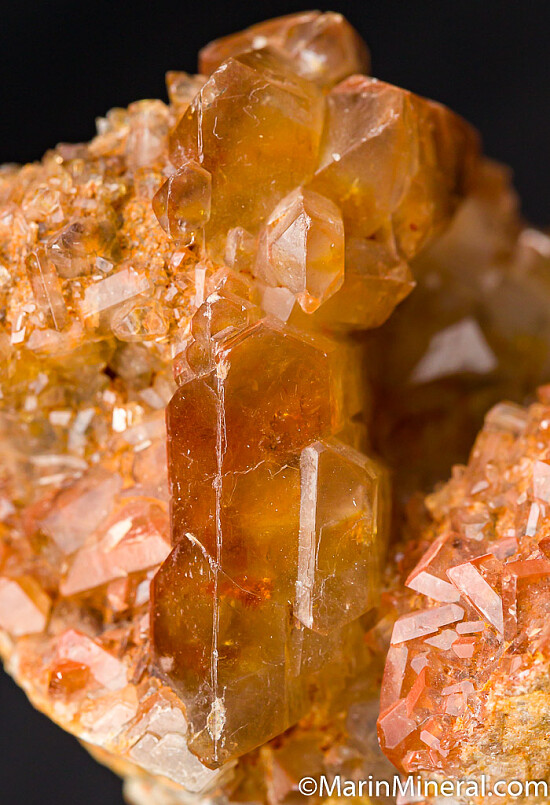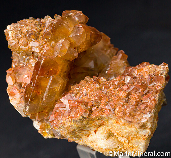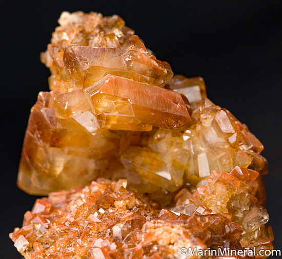 Golden Barite crystals covering matrix. There is a range of crystal sizes all the way up to 3cm. The crystals are tabular, thick, and show gem areas. Uncommon specimen.