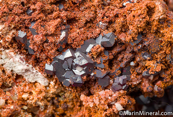Sharp crystals of Cuprite on a reddish matrix. There are also small crystals of other minerals present, including yellow Mimetite crystals. Ex. Chuck Trantham collecton, valued at $300.