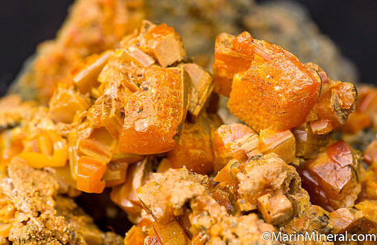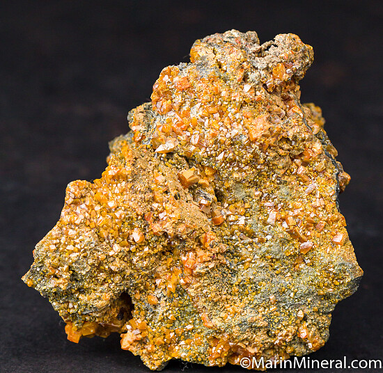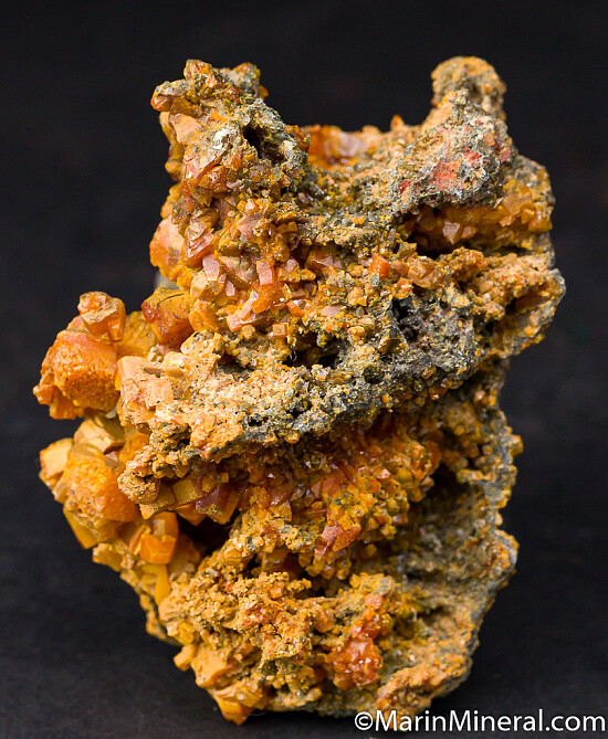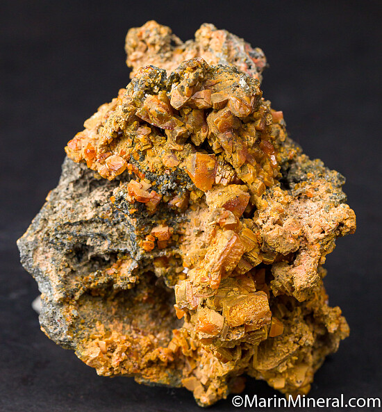 Historic specimen of orange Wulfenite crystals on matrix. The Wulfenite crystals are everywhere, covering all sides. The crystals are thick, reaching 1cm in size, and the form varies from more dipyramidal to tabular. Ex. Chuck Trantham collection.