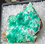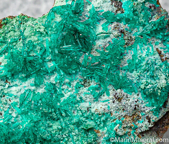 Bright, vitreous acicular crystals of Diotase covering the top surface. The crystals are elongated, transparent, and stand up off the matrix. Great color! Old Arizona classic.