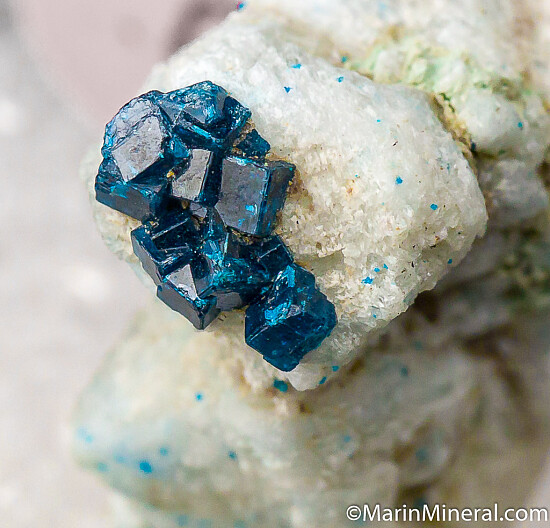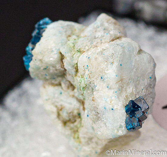 Numerous small cubes of the rare mineral Boleite in two areas, perched on the tips of a cluster of white Anglesite crystals.