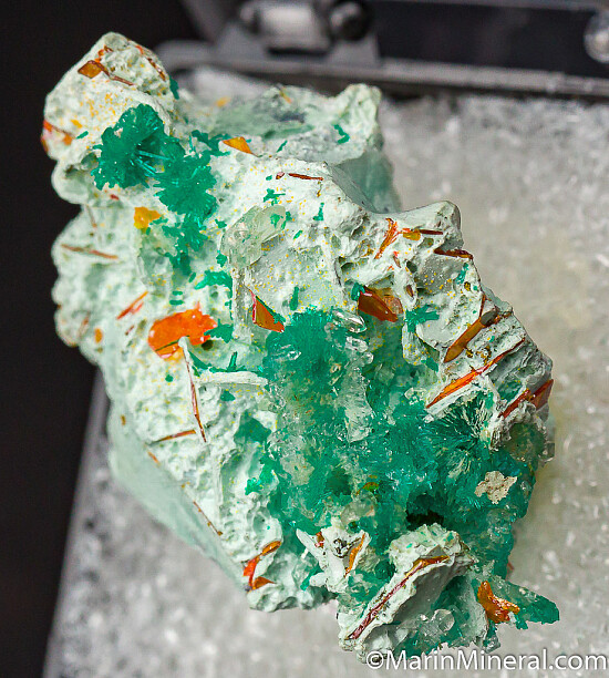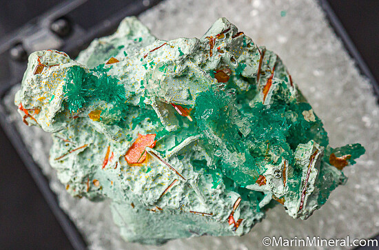 Clusters of vibrant emerald green Dioptase crystals and orange Wulfenite crystals on a Chrysocolla coated matrix. Additionally, there are small clear Quartz crystals present. Acquired from the Chuck Trantham collection, these have appreciated in price significantly in recent years.