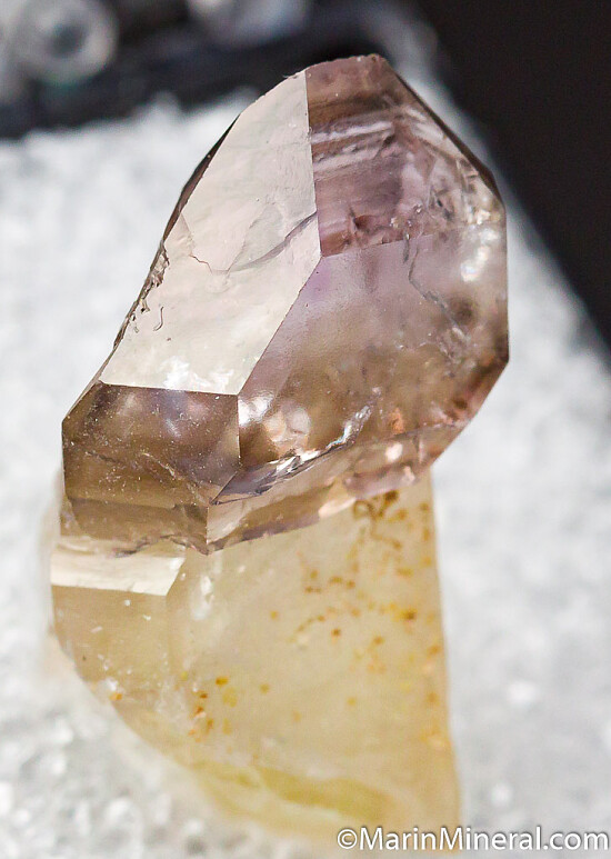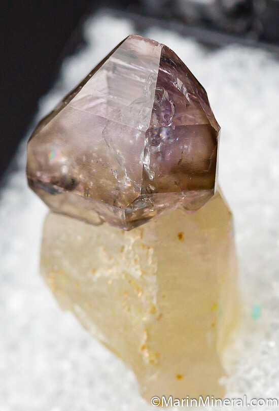 Single undamaged Quartz scepter from the famous Fat Jack Mine in Arizona with a purple Amethyst scepter head over a white Quartz stalk.