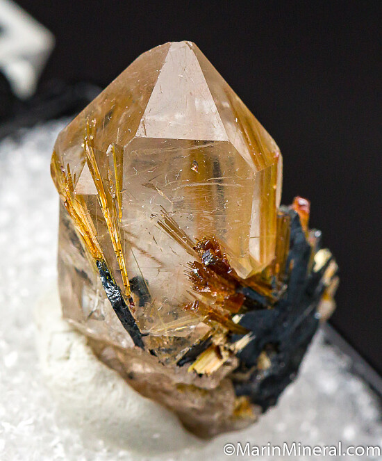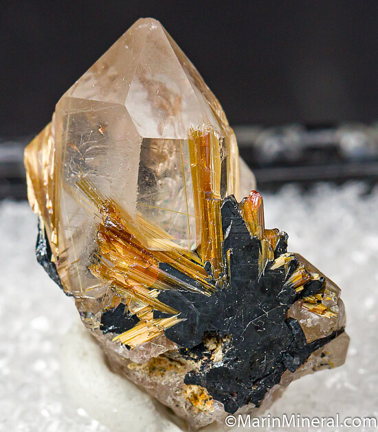 Really showy thumbnail combo of the 3 species (hard to get all 3 together in a cute thumbnail like this!). Golden Rutile and Hematite attached to the front of a clear Quartz crystal. The Quartz has both attached and included Rutile. Hard to find a thumbnail with both a Quartz and the Rutile radiating out of a Hematite crystal. Valued at $150.