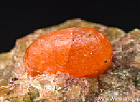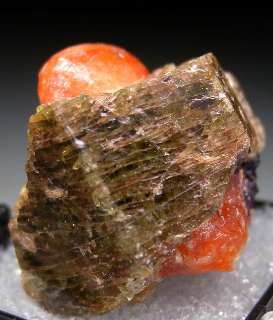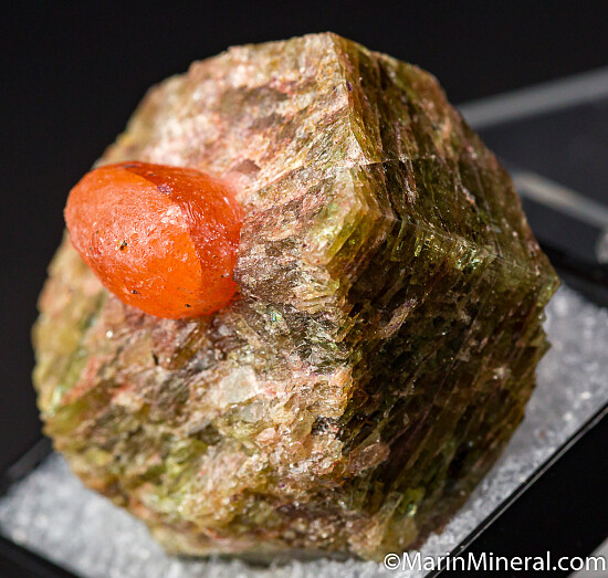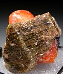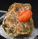 Rounded, nodular orange Calcite inside a partial crystal of Apatite. This is a really odd thumbnail with the orange Calcite sticking out both the fron and back sides of the Apatite. Strange!