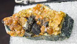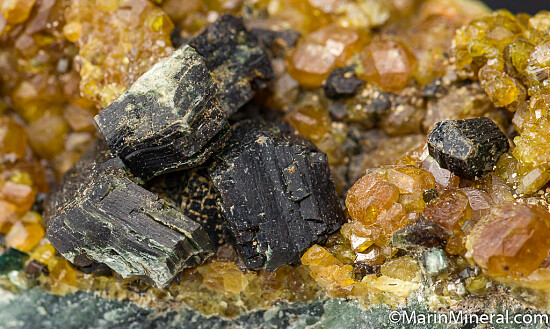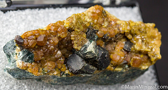 Golden colored Topazolite crystals and large books of green Clinochlore on matrix. Sort of reverse of most of these - instead of isolated Topazolite crystals on drusy Clinochlore, you have large distinct Clinochlore atop drusy Topazolite. Found near the Benitoite Gem Mine. Ex. Chuck Trantham collection, collected by Chuck and Al McGuinness in May 1983. Valued at $150.