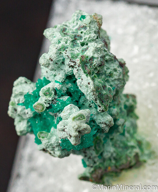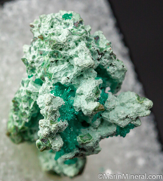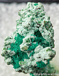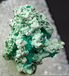 Clusters of vibrant emerald green Dioptase crystals on matrix. The Dioptase occurs in clusters to 5mm wide in various vugs.