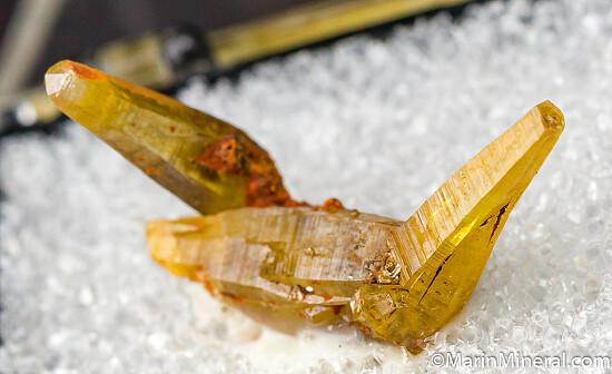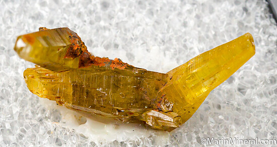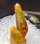 Three interconnected crystals of yellow Mimetite. Main crystal is 15 x 5mm with a well terminated crystal on the left rising up. Ex. Bideaux Minerals specimen.