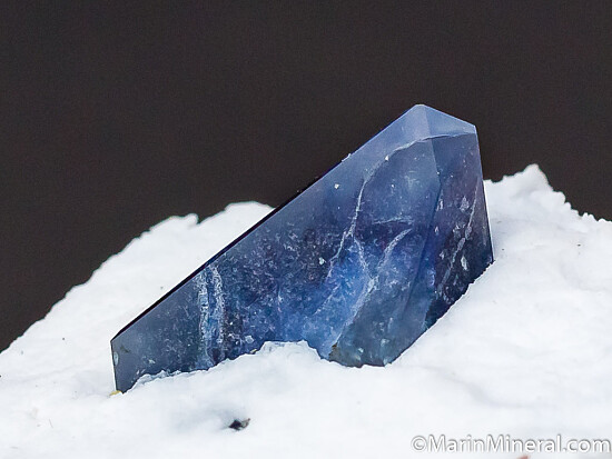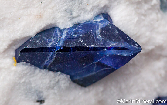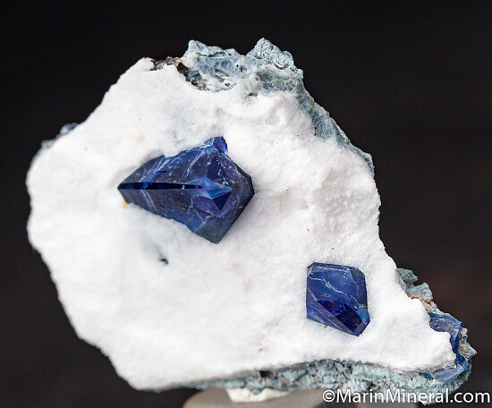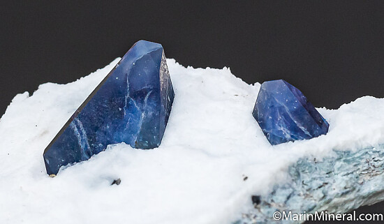 Two blue Benitoite crystals on an island of white Natrolite. Largest Benitoite is 1.7cm. The crystals are deep blue and gemmy at the tips, and undamaged. Recently etched, never before offered for sale.