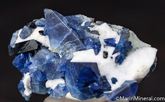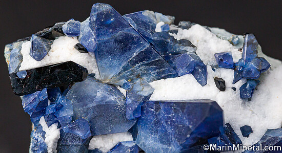 Blue Benitoite crystals and black Neptunite crystals on white Natrolite over schist. The two largest Benitoites are 1.5cm and sit up nicely for display. The crystals are deep blue with gem areas and undamaged. Recently etched, never before offered for sale.