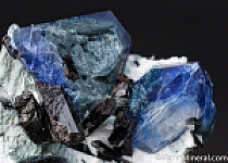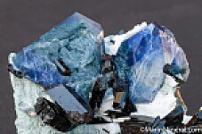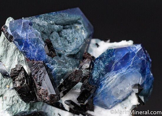 Large blue Benitoite crystals and black Neptunite crystals on white Natrolite over schist. Largest Benitoite is 2.3cm and there is another large, thicker crystal 2cm in size. Main crystal has cavernous growth in the center but is undamaged. Even though some of the Neptunites show contacting from growth into the opposing pocket wall, there are some really nice crystals present, including a neat cluster and a perfect, 2cm double-terminated crystal. Large Benitoite crystals!! Recently etched, never before offered for sale.