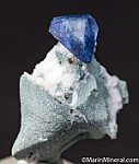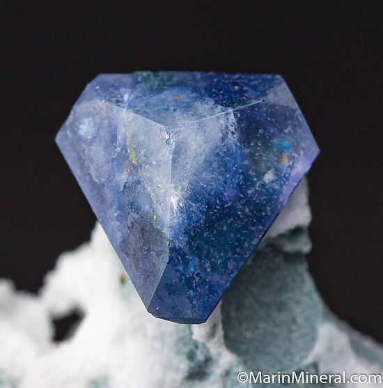 Killer thumbnail featuring a 9mm triply terminated blue Benitoite crystal perched atop white Natrolite and schist. All three terminations well exposed. Undamaged, deep blue with gem zones. Recently etched, never before offered for sale.