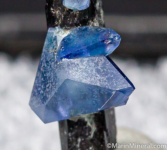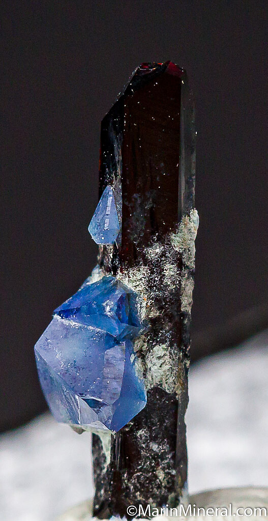 Small but highly aesthetic specimen of a 5mm triply terminated blue Benitoite crystal on a Neptunite crystal. The Neptunite is only a partial crystal, but the Benitoite crystals are perfect and what matter here. Old specimen.