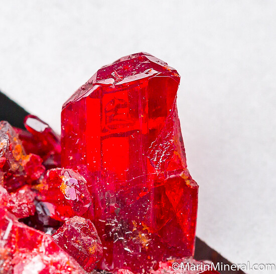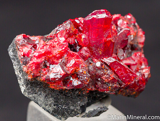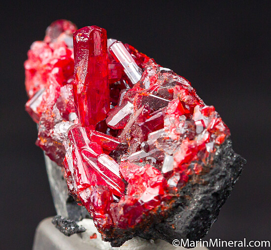 Glassy, transparent red Realgar crystals on a black matrix. Well terminated crystals that reach 1cm in size. These are the nicest Getchell Realgar crystals I've ever had, Shimen, China in quality but from Nevada! Ex. Peter Megaw, Chuck Trantham.