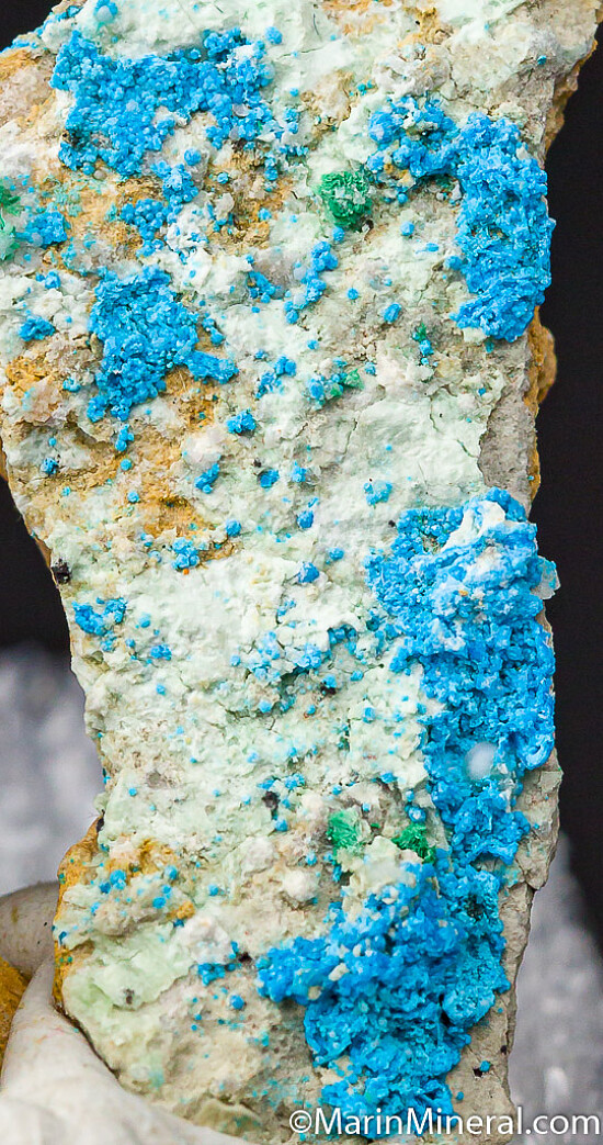Two thumbnail sized specimens with blue Decrespignyite and white Tengerite.
