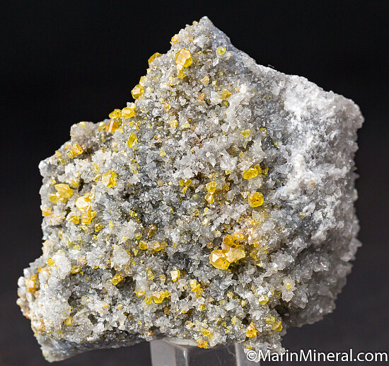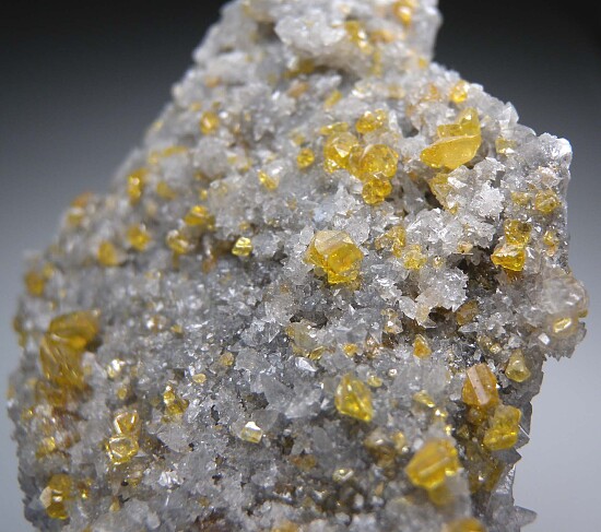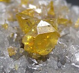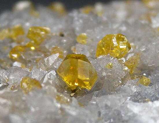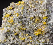 Bright yellow crystals of Sphalerite atop clear Calcite. The Sphalerite have a great yellow color and are gemmy. The Calcite coats both sides of specimen. Yellow Sphalerite of this color is uncommon worldwide. Ex. Chuck Trantham collection.