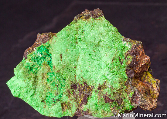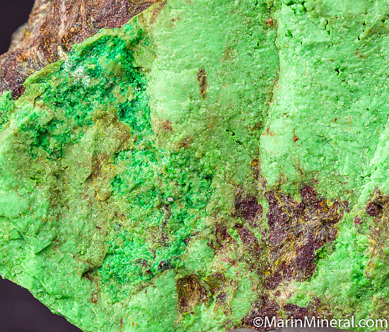 Thick layer of green Widgiemoolthalite on matrix. The Widgiemoolthalite is mostly massive light lime green with areas of darker green micro crystals. The 132 North open pit nickel mine has produced the greatest variety of secondary nickel minerals found anywhere in the world to date, some being the best of their species. It is the only locality for Widgiemoolthalite. Ex. Robert Phillips collection.