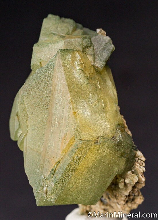 Crystals of Adularia with surface coatings of Chlorite to 4cm long on a small amount of matrix. Aesthetic form and high quality old specimen. Ex. Laurent Gautron collection.
