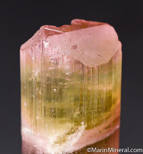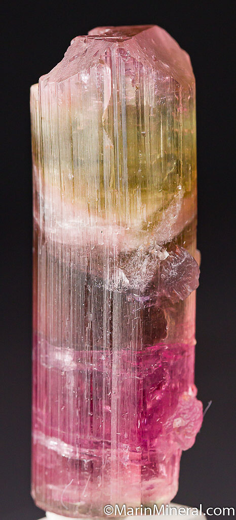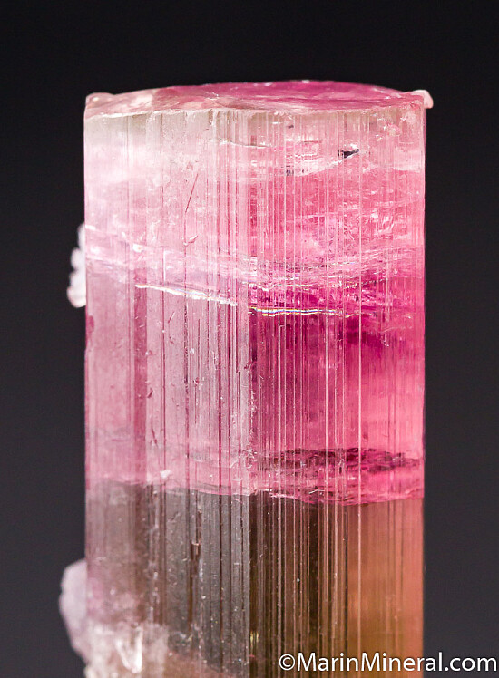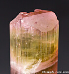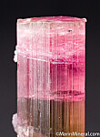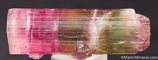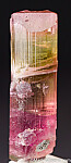 Double-terminated pink and green Tourmaline crystal with attached Lepidolite. The prism faces are perfect and complete all round. One termination is perfect and has some hollow/stepped growth, the other (pink) termination is flat and lustrous but has some edge chipping. Gemmy with good color and weighs 28.7 grams.