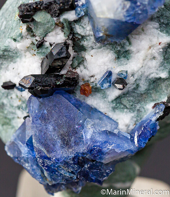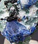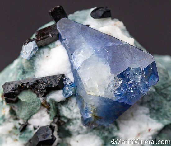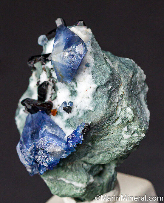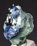 Benitoite and Neptunite crystals on schist matrix with white Natrolite. The highlight of this specimen is a 1cm triply-terminated crystal. The crystal has all terminations exposed and there is an area of natural indentation or breakage on part of the face. There is also a crystal of the rare mineral Joaquinite present. A fantastic combinatin specimen from this closed locality, which was the only significant source of this rare gem mineral. Valued at $400 and sure to increase over time as the already limited supply continues to dry up.