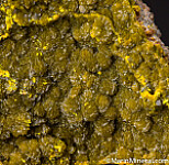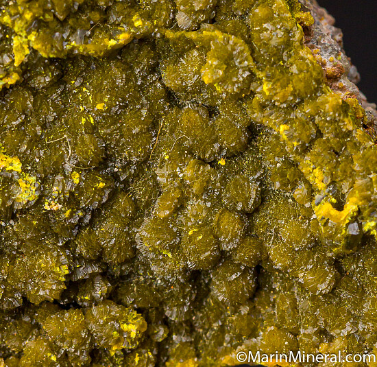 Satiny, botryoidal crystals of Francevillite and Vanuralite covering the majority of the top surface of the matrix.