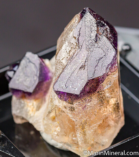 Two Amethyst scepters grown atop clear Quartz crystals. There is an unidentified yllow mineral on one side and some smokey zones inside the clear Quartz. Undamaged and a really neat and uncommon old specimen from teh Chuck Trantham collection.