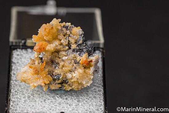 Crystals of Pyrargyrite and Polybasite on matrix and partially covered by Calcite crystals.