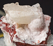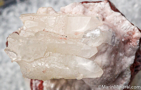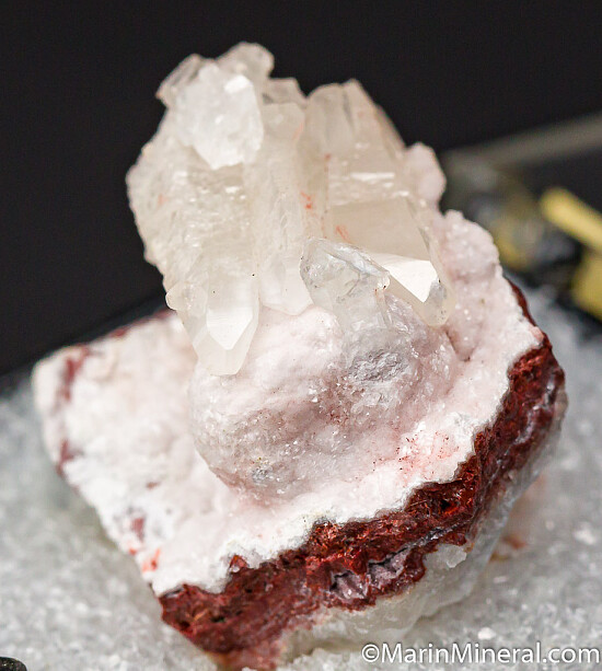 Elongated colorless scalenohedral Smithsonite crystals on matrix covered by white Dolomite crystals. Ex. Dick Bideaux minerals.