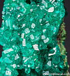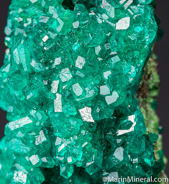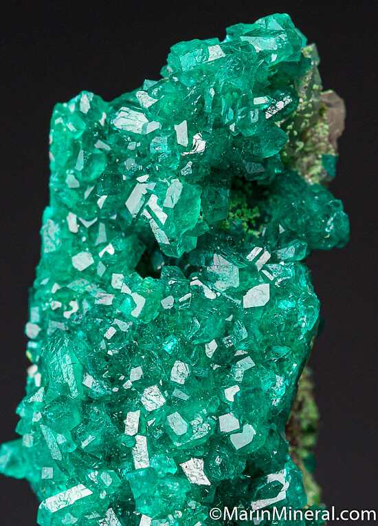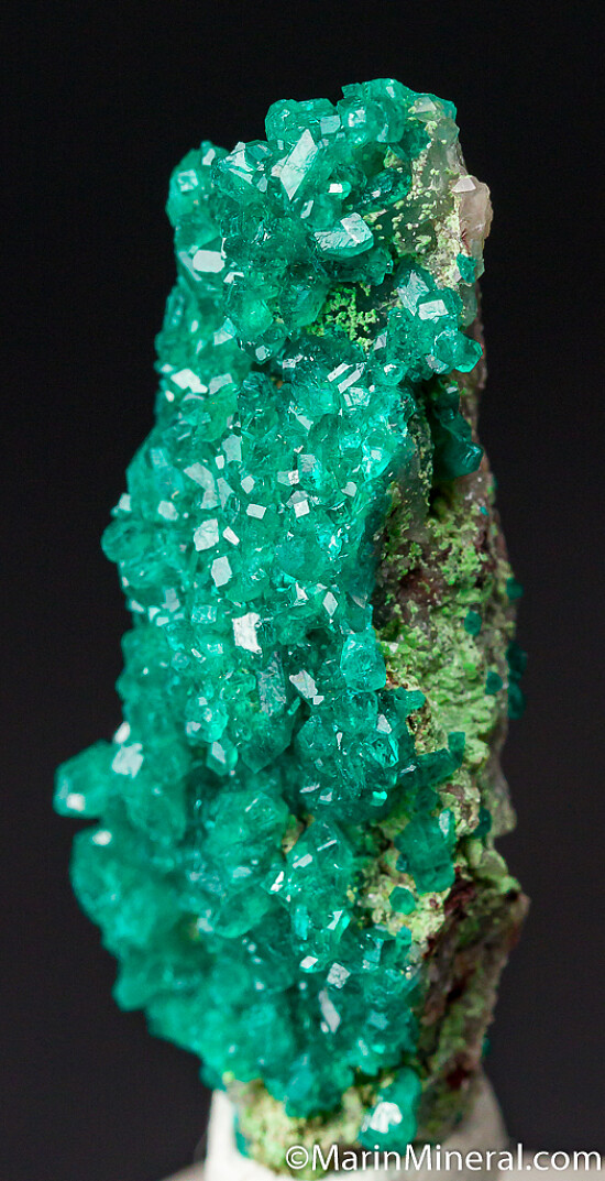 Bright, sparkling emerald green crystals of Dioptase on both sides of a Duftite coated matrix. Highly attractive Tsumeb classic.