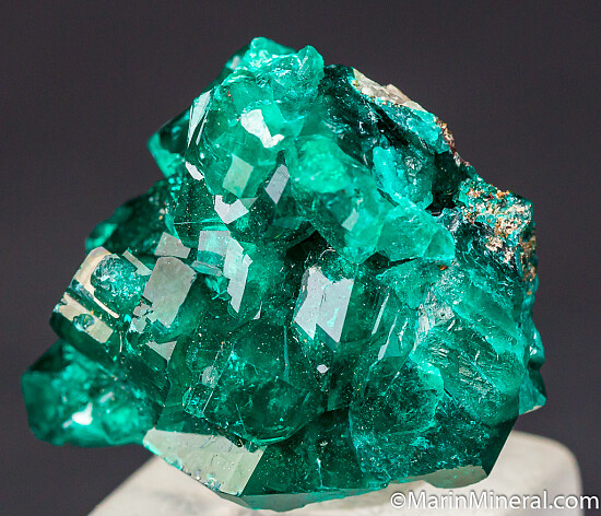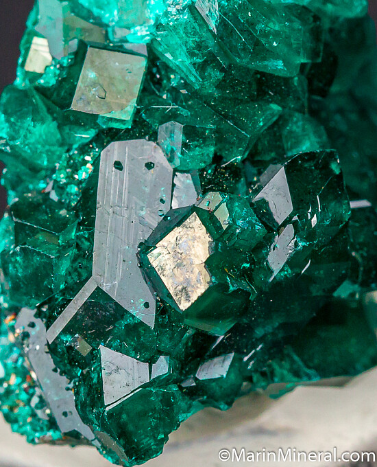 Bright, sparkling emerald green crystals of Dioptase. The specimen is nearly solid Dioptase with large crystals to 8mm in length. Highly attractive Tsumeb classic.