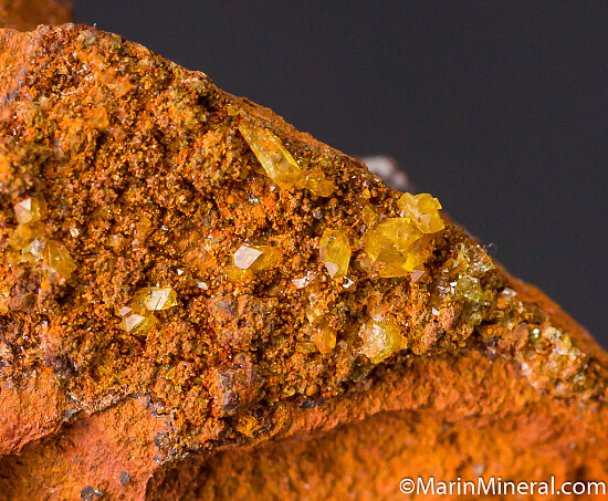 Golden Legrandite crystals on matrix. Small but bright, glassy crystals. Come swiith an old Al McGuinness label.