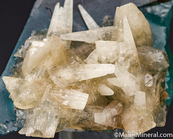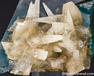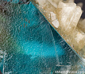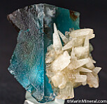 Crystals of white Calcite attached to a blue Fluorite crystal. This crystal has the great blue color that is so desired from the Minerva Mine. Ex. Chuck Trantham collection.