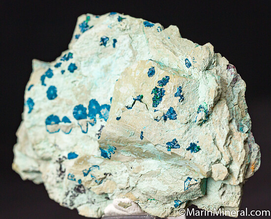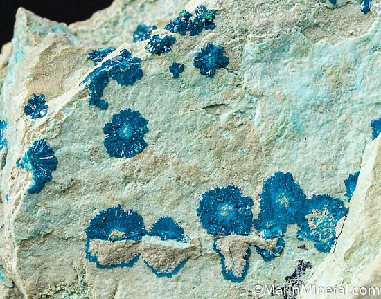 Radial groups of blue Cornetite crystals with Chrysocolla on matrix. Cornetite is a Copper phosphate mineral discovered in 1917 and named after the geologist Jules Cornet. This style with radial groups are from old finds seldom seen now. Valued at $200.