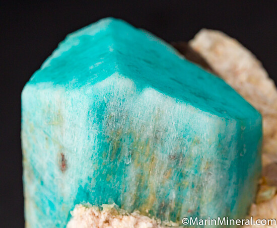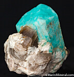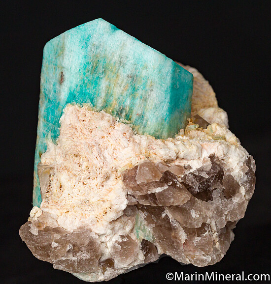 Well formed, 6.5cm single Amazonite crystal with attached Smokey Quartz and Albite crystals. The Amazonite is complete all around and undamaged. Ex. Chuck Trantham and Cliff Krueger collections. Originally acquired by Cliff in May 1966 for $20!