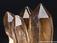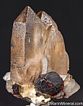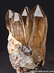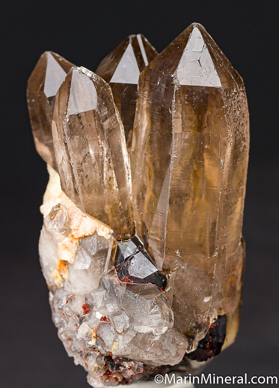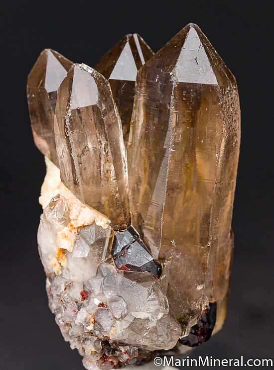 Cluster of tall, transparent smokey Quartz crystals with attached Spessartine crystals. Ex. Chuck Trantham collection.