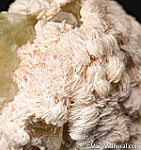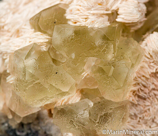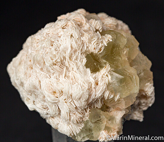 Round, mound-shaped specimen of pink Barite with attached cubes of Fluorite. The Fluorite is a pale yellow/green with modified corners. Undamaged and well crystallized all around. Ex. Chuck Trantham collection, purchased from Frazier's Minerals in 1979, acquired by Frazier's from Frank and Wendy Melanson.