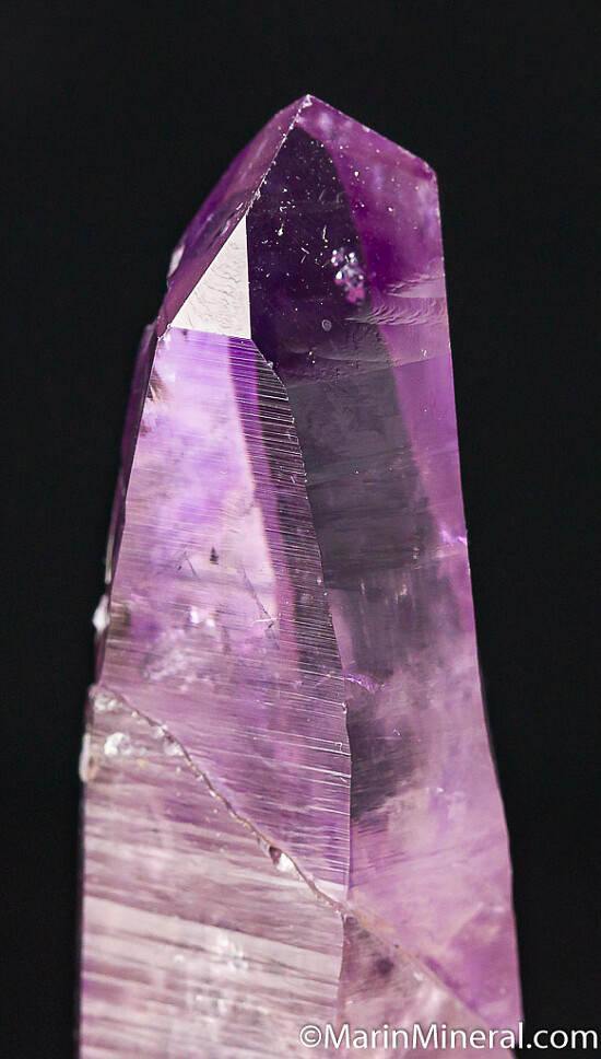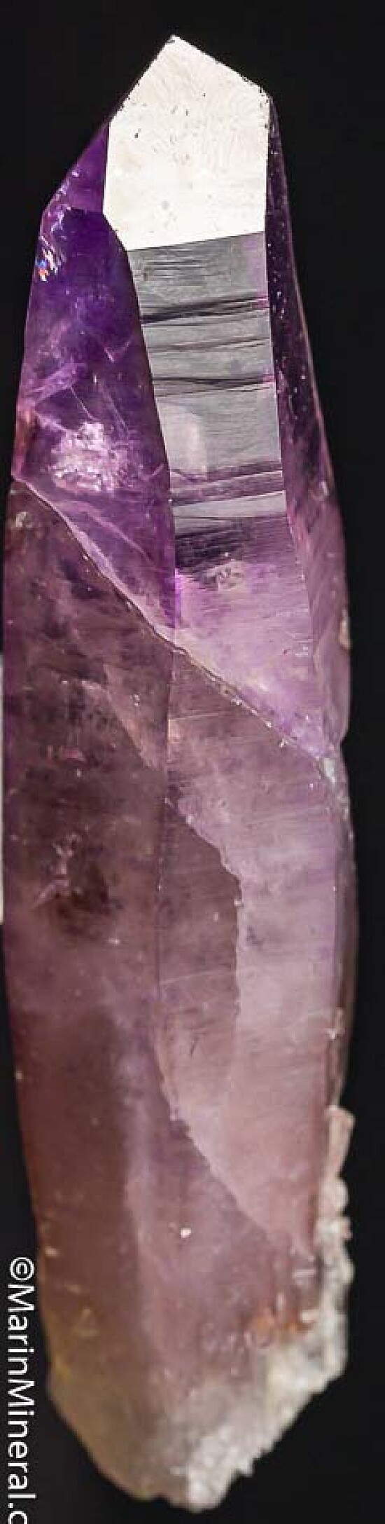 Long, transparent single Amethyst crystal, highly transparent in the upper half. Great luster and complete all around. This is a good sized crystal for this hard to find old specimen. There is a fractue midway up the crystal, and it's possible this crystal was repaired. Even so, the upper half would make a fabulous 4cm crystal, which wuold still be a great crystal for the locality. Ex. Chuck Trantham collection. Chuck's old label notes that he bought this in 1985 from the Vista Verde Rock Shop in Green Mountain Falls, Colorado for a price of $55, which was a fairly high priced crystal 35 years ago.