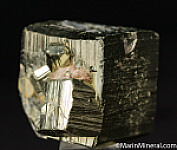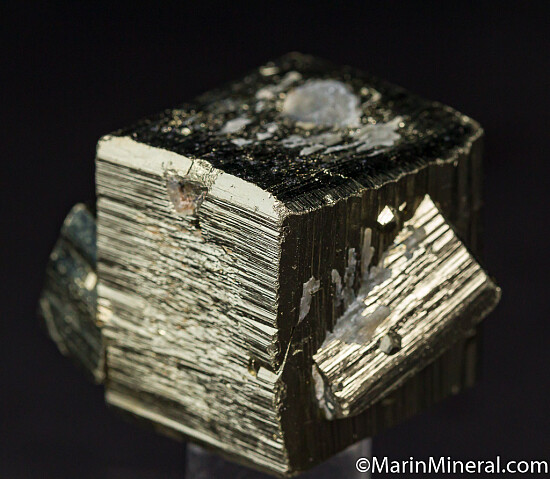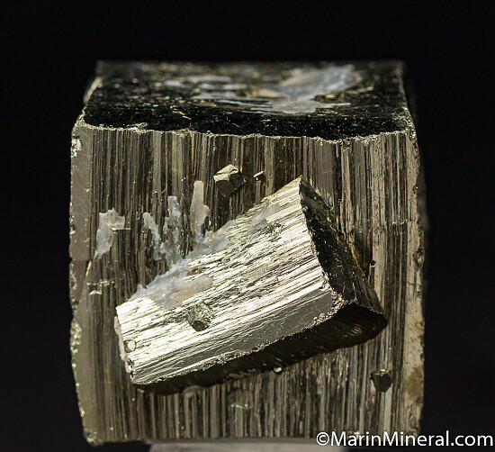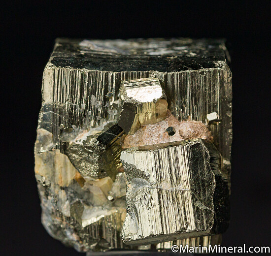 Large brassy Pyrite crystal, 2.8cm on edge, with additional attached crystals. Complete and nicely striated with the exception of one corner which is contacted from matrix. Ex. Chuck Trantham collection.