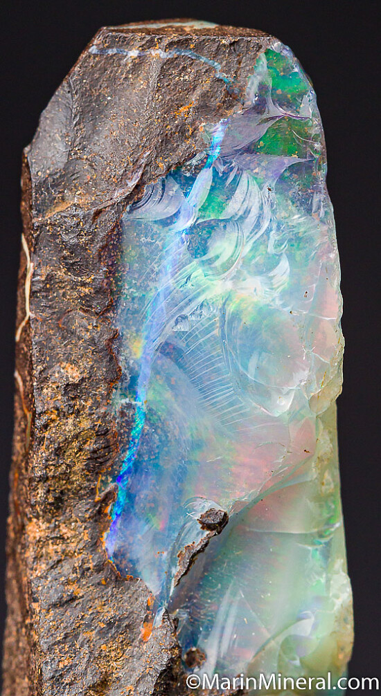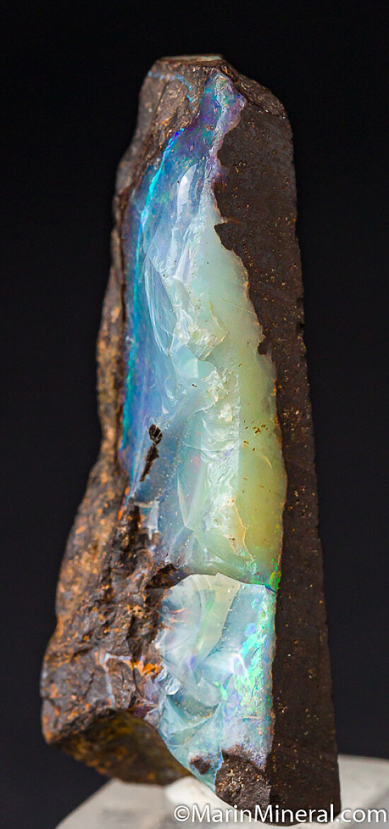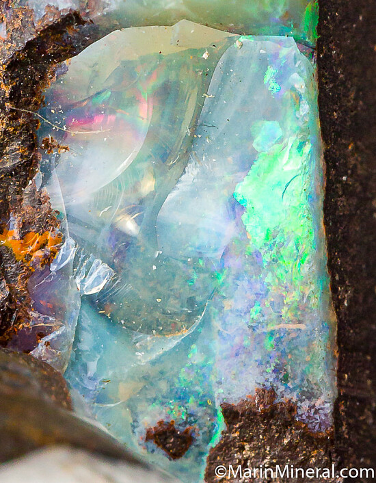 Precious opal on brown rock matrix known as 'Boulder Opal'. The opal has flashes of green, red, blue, and yellow.