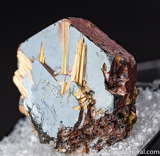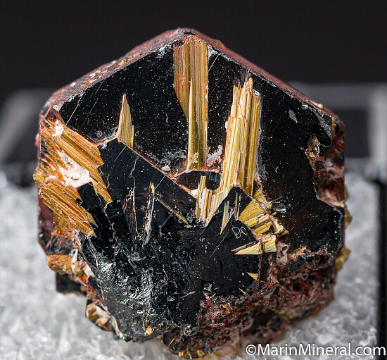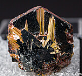 Thick, tabular crystal of Hematite with attached needle-like crystals of golden Rutile. Ex. Chuck Trantham collection. The old label indicates incorrectly that this is Rutile on Ilmenite. An old sticker on the back shows a price of $50.