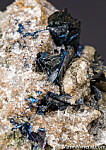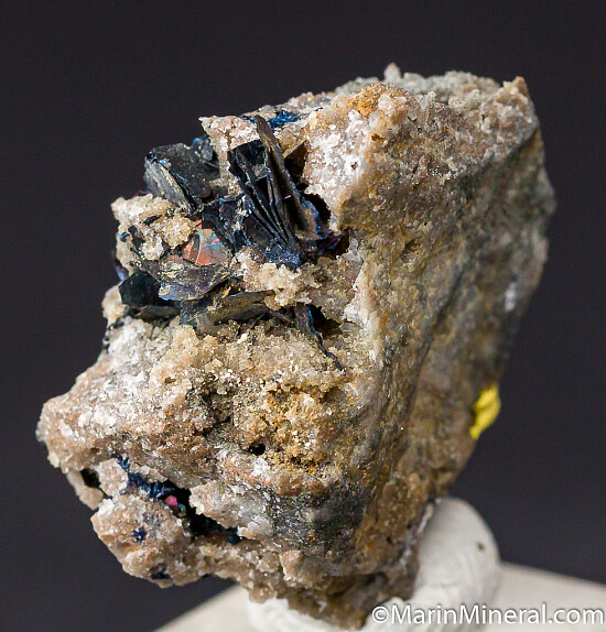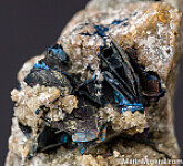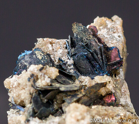 Irridescent blades of Covellite crystals in a few different areas on matrix. Ex. Chuck Trantham collection.